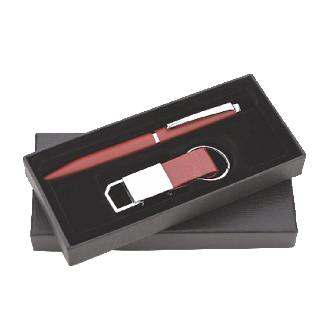 Premium red metal pen paired with a leather & metal keychain, elegantly placed in a black gift box. Perfect for executive gifting and events. Ideal for bulk corporate orders, employee appreciation, festive gifting, and brand promotions. Custom branding available on request.