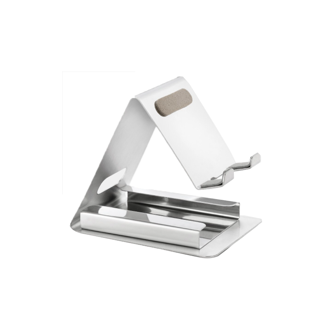 This silver mobile stand provides a sleek and practical solution for your desktop. It not only holds your phone at a convenient angle but also includes a dedicated space for a memo pad or sticky notes. Its durable metal construction ensures stability, while its minimalist design enhances any workspace.