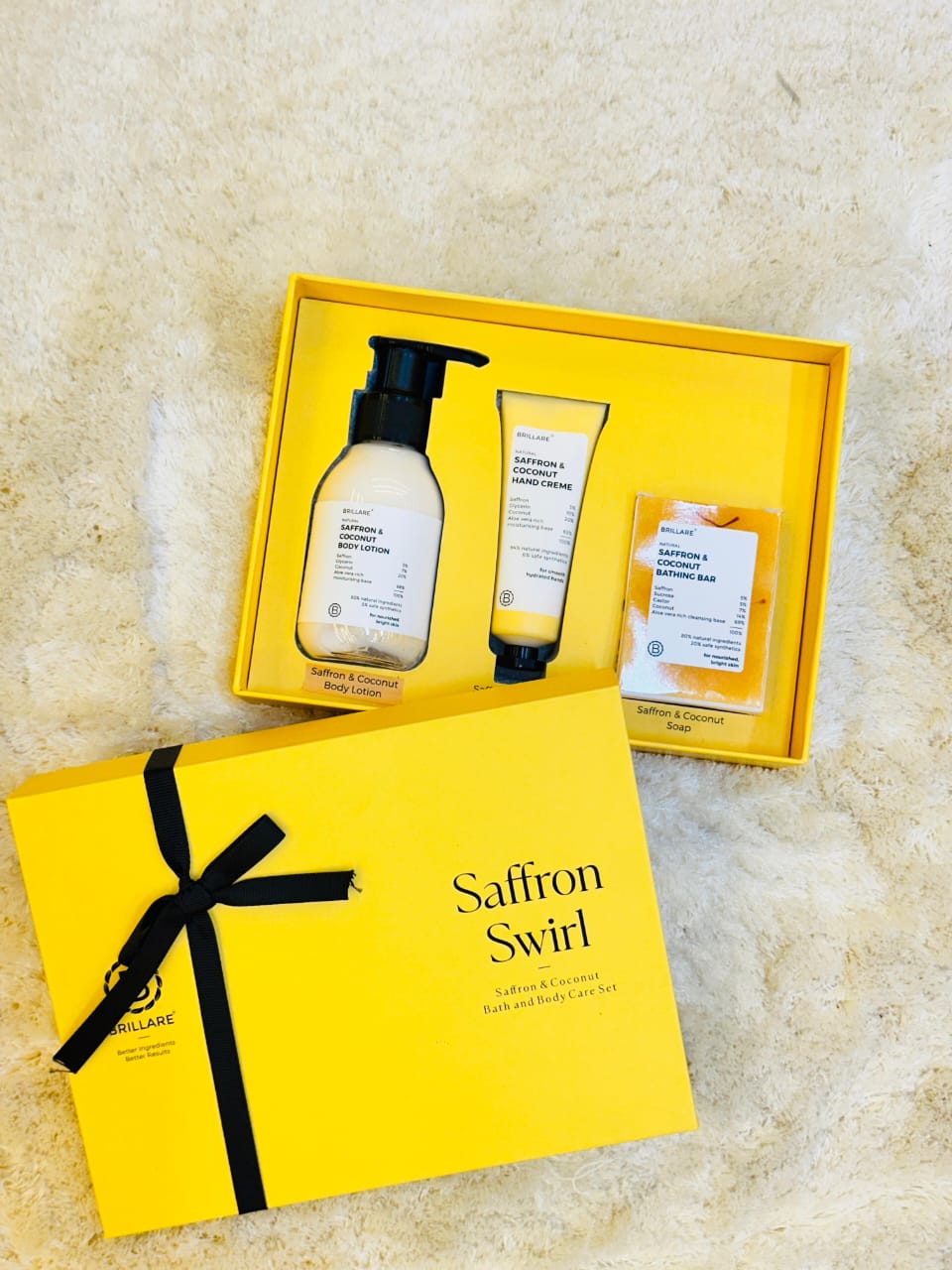 Experience the radiant glow of saffron combined with the hydrating benefits of coconut. This set includes a Saffron & Coconut Body Lotion, Hand Crème, and a Cleansing Bar, designed to brighten your skin and provide a warm, luxurious fragrance. Each gift set is beautifully packaged, making it a perfect present for any occasion.